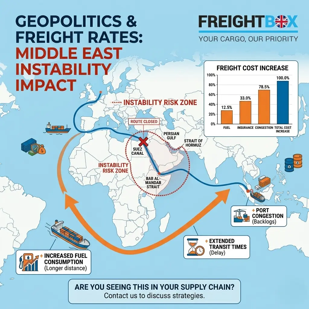 Ongoing instability in the Middle East is continuing to ripple through global supply chains, creating uncertainty and upward pressure on freight rates. At Freightbox Global, we are already seeing clear and measurable impacts across key Far East to Europe trade routes – particularly for businesses reliant on consistent transit times and stable pricing.